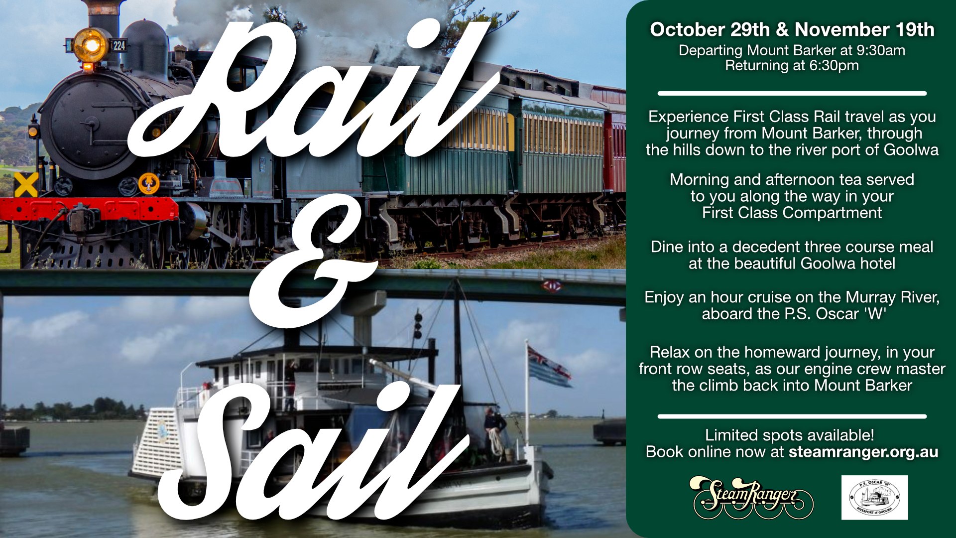 SteamRanger introduces a new experience for those who want to travel by a steam hauled train and a steam powered Paddle Steamer with lunch in between.