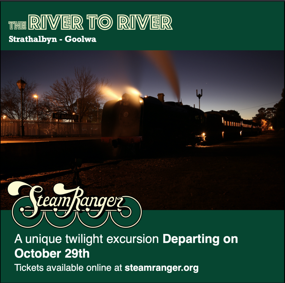 Departs Strathalbyn 6.40pm Saturday October 29, arrives at Goolwa at 7.40pm. Passengers get 50 minutes in Goolwa Departs Goolwa at 8.30pm, arrives back at Strathalbyn at 9.30pm The train…