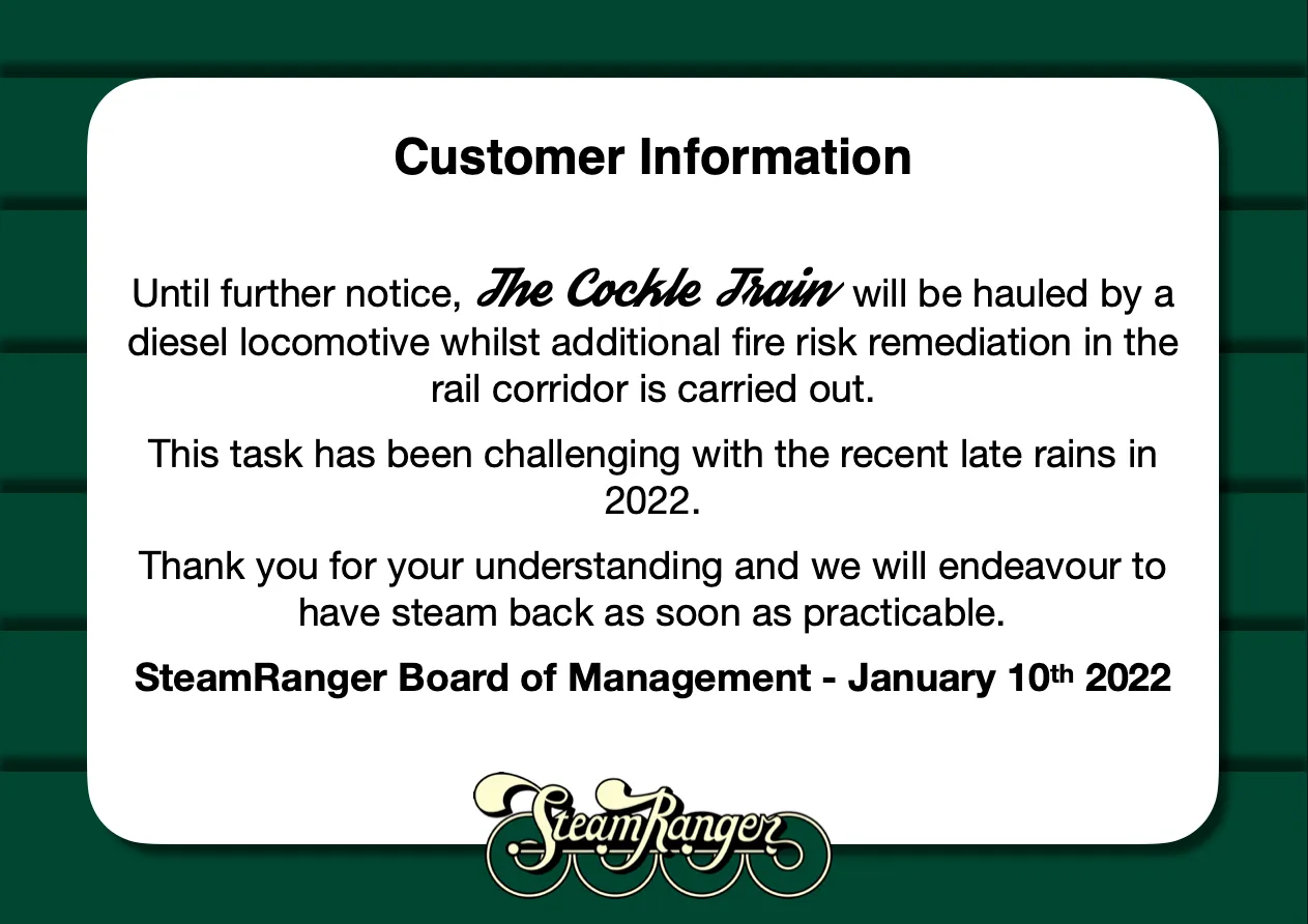 Jan102023Uncategorized Author: James Andonopoulos Post navigationPreviousPrevious post:January 7th & 8th Diesel ServicesNextNext post:SteamRanger receives confirmation of $8.9m in fundingRelated newsConcrete Sleepers for SteamRanger8 March 2023Join SteamRanger this upcoming long weekend for a ride aboard The Cockle Train!5 March 2023SteamRanger receives confirmation of $8.9m in funding5 February 2023January 7th & 8th Diesel Services7 January 2023Summer is here, and at SteamRanger that means one thing – Cockle Trains!25 December 2022Rx207 & Rx224 Pass Annual Steam Tests12 December 2022The News Years Eve Special5 December 2022SteamRanger Heritage Railway presents: The Southern Lights Special5 December 2022Cockle Train Running As Usual20 November 2022