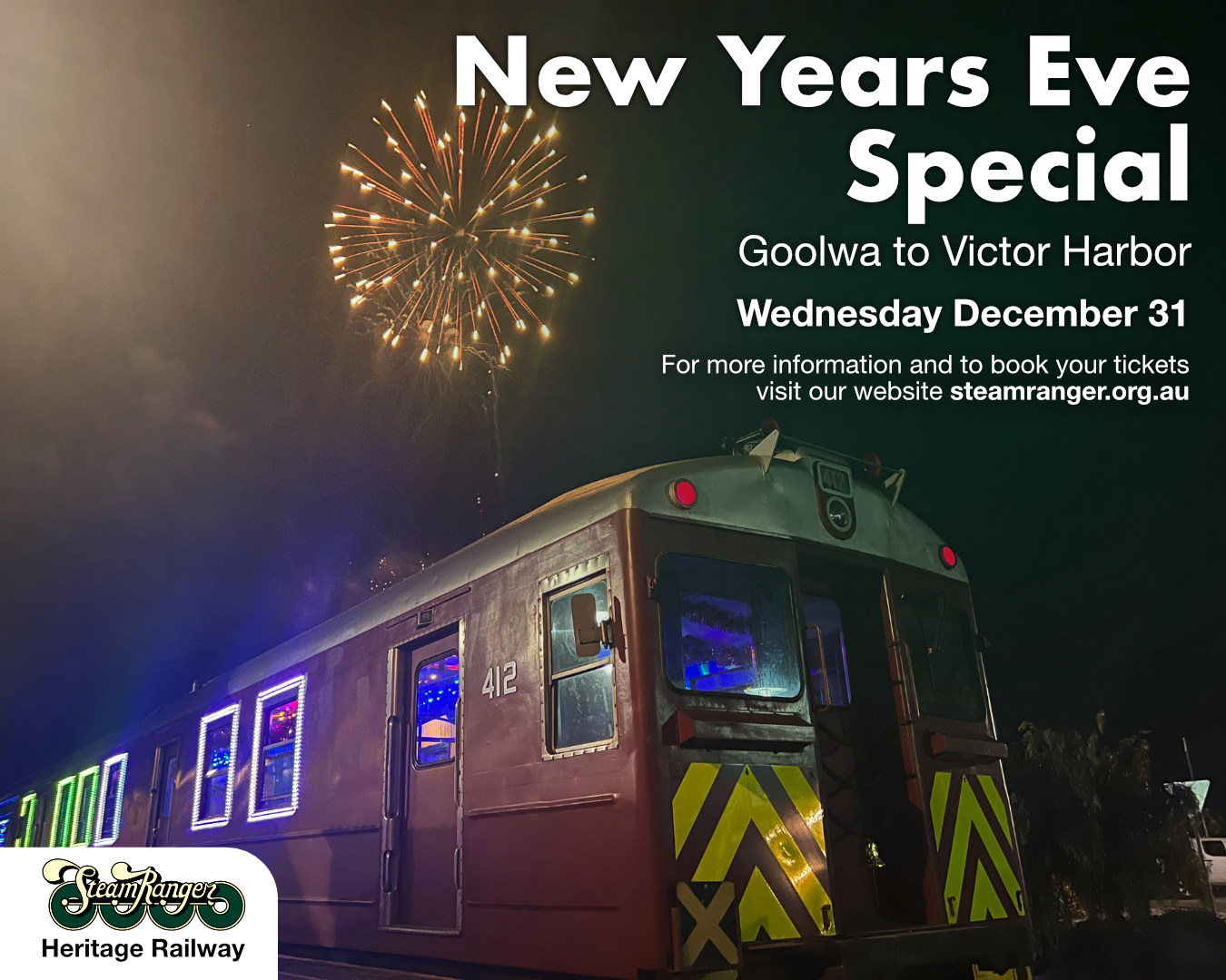 The train will depart Victor Harbour at 10.45pm for Goolwa, arriving in time for passengers to see in the New Year, and enjoy the spectacular fireworks display off the Hindmarsh Island bridge!