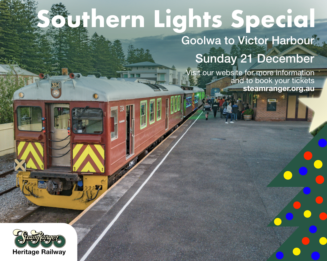 The “Southern Lights”, will depart Goolwa, heading for Victor Harbor, and the Christmas Artisan Markets in the station forecourt.