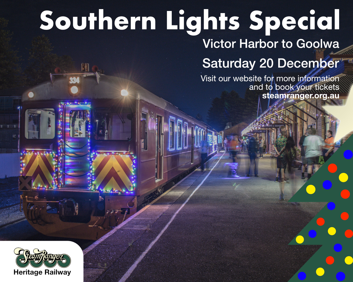 The “Southern Lights”, will depart Victor Harbor, and will travel to Goolwa for the Goolwa Community Group Christmas Concert, held in Jaralde Park (Right behind the station).