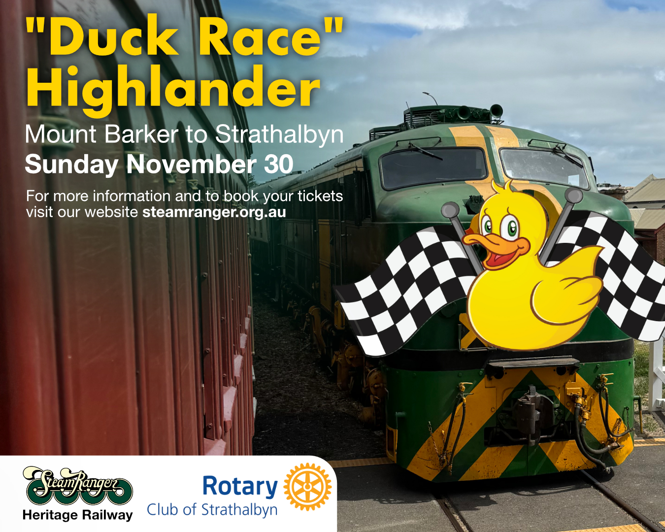 SteamRanger in conjunction with the Strathalbyn Rotary Club invites you travel from Mt Barker to Strathalbyn by train and witness Strathalbyn’s famous “Duck Race” in the Strathalbyn Soldiers Memorial Gardens.